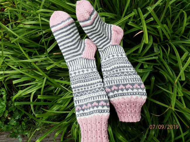 Meiltä löytyi pienet kengät,tein niihin sukat.Mitähän omistaja tuumaa.Pienet Olga sukat jämälangasta.