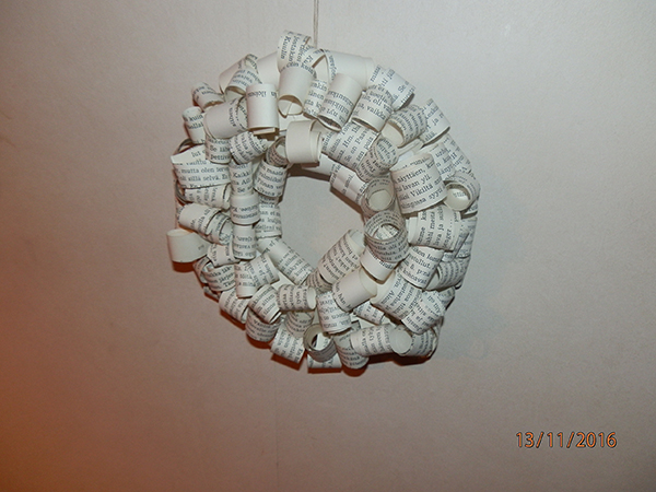 Pinterestistä katselin kirjasta tehtyjä kranseja.mutta tein omalaiseni.Styrox pohjainen kranssi,kirjasta leikatut paperipalat ja saksilla vedetty rullalle,liimattu.Hyvin yksinkertaista.
